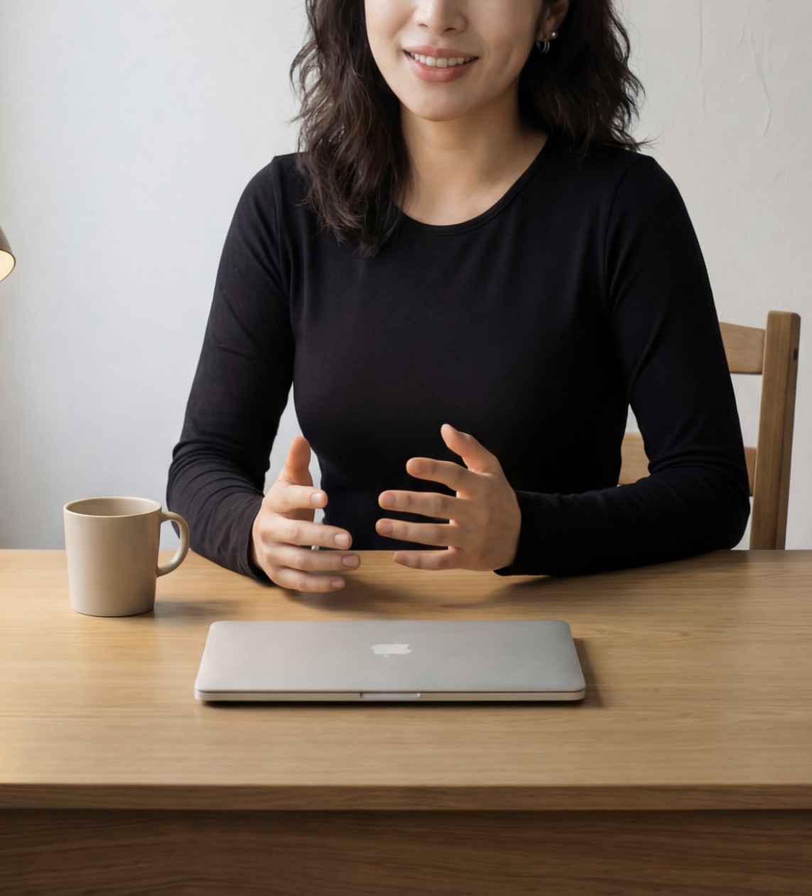 (검은 옷을 입고 나무 책상에 앉아 매력적인 프레젠테이션을 하는 전문적인 여성. 그녀는 손을 표면에서 부드럽게 들어 올려, 개념을 설명하기 위해 자연스럽고 유연한 손동작을 사용하며, 손바닥을 펴서 요점을 강조한다. 그녀의 표정은 자신감 있고 생동감 넘치며, 약간 고개를 끄덕인다. 움직임은 절제되고 사실적이다. 극사실주의, 시네마틱 조명, 8k.)