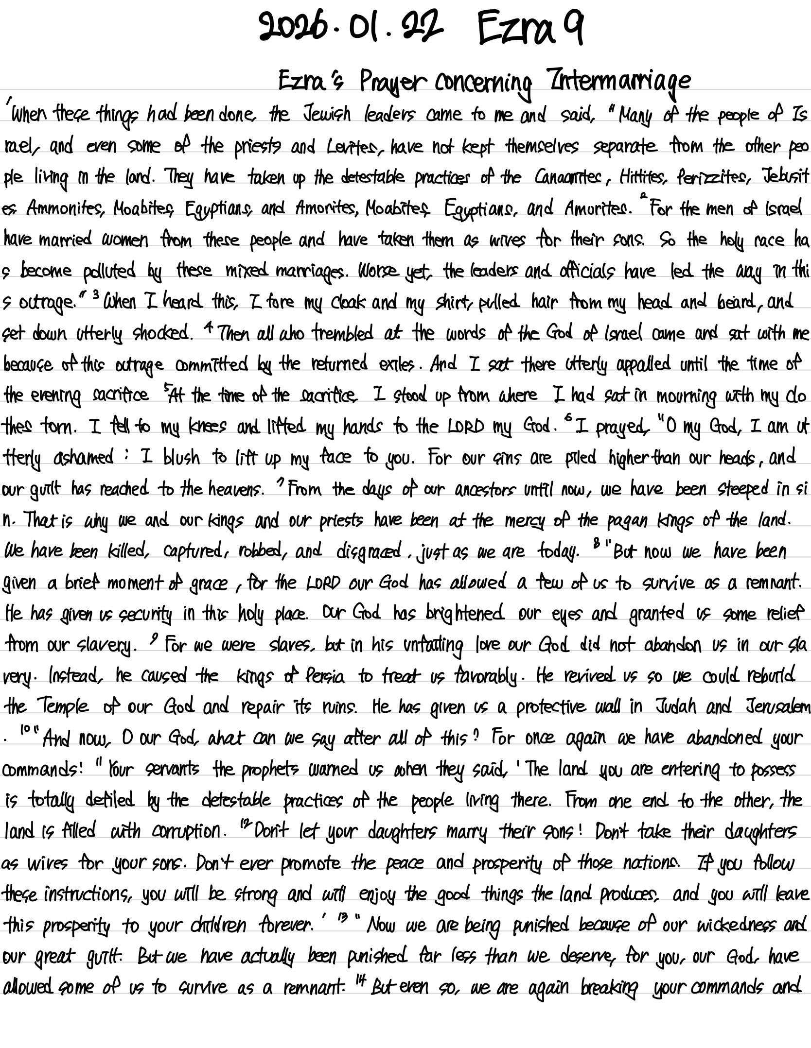 | [영어숙제] 2026.01.23 Ezra 10, Nehemiah 1 (0) | 2026.01.24 |