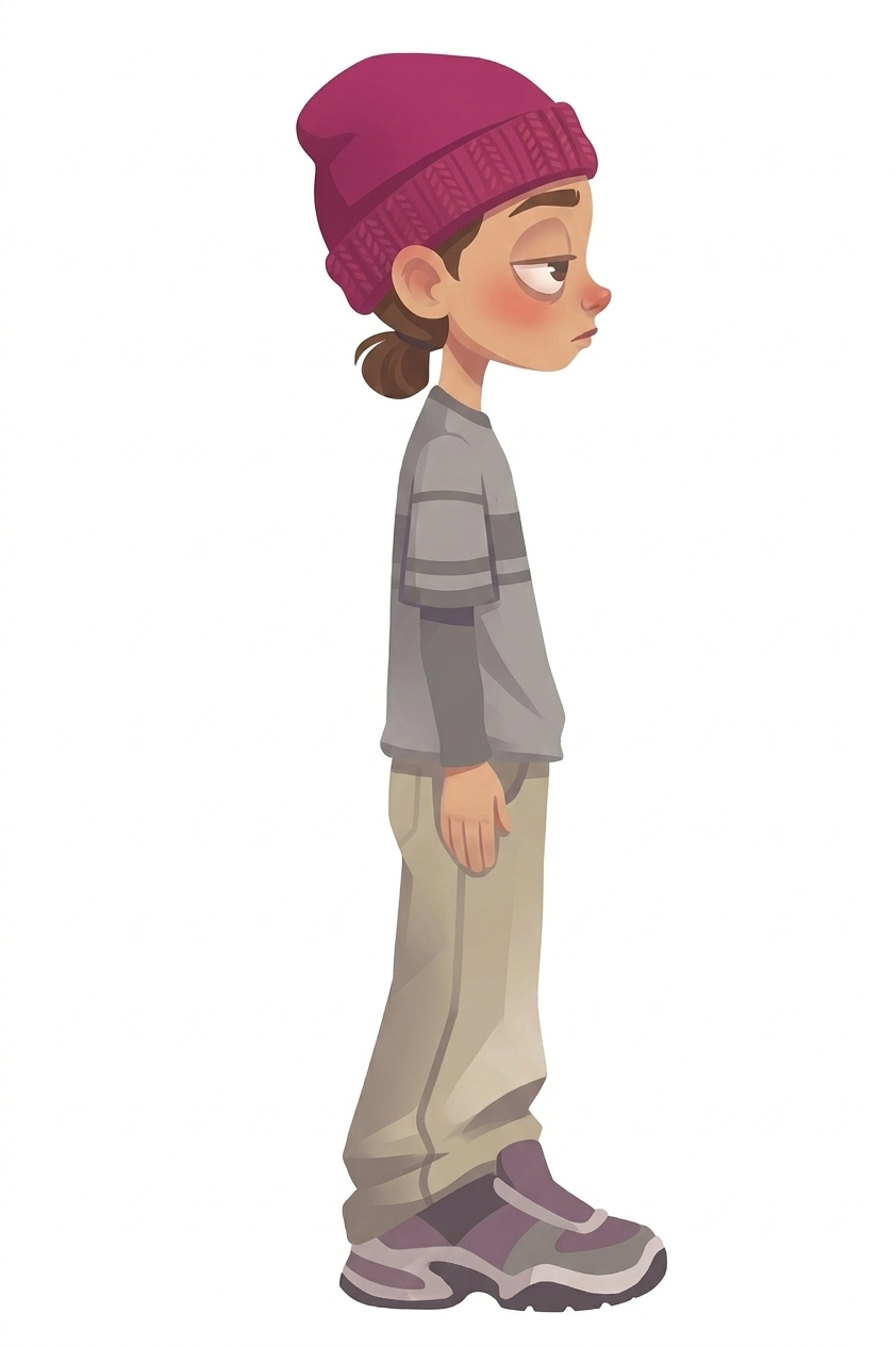 본 프로젝트의 애니메이션 파트는 감정 전달력을 높이기 위해 2D 데포르메 캐릭터를 기반으로 구성했다. 주인공 캐릭터는 큰 비니, 와이드 팬츠, 큰 신발이 특징으로 작년 자주 입고 다녔던 룩을 표현했다. 피로한 눈매가 포인트이다.